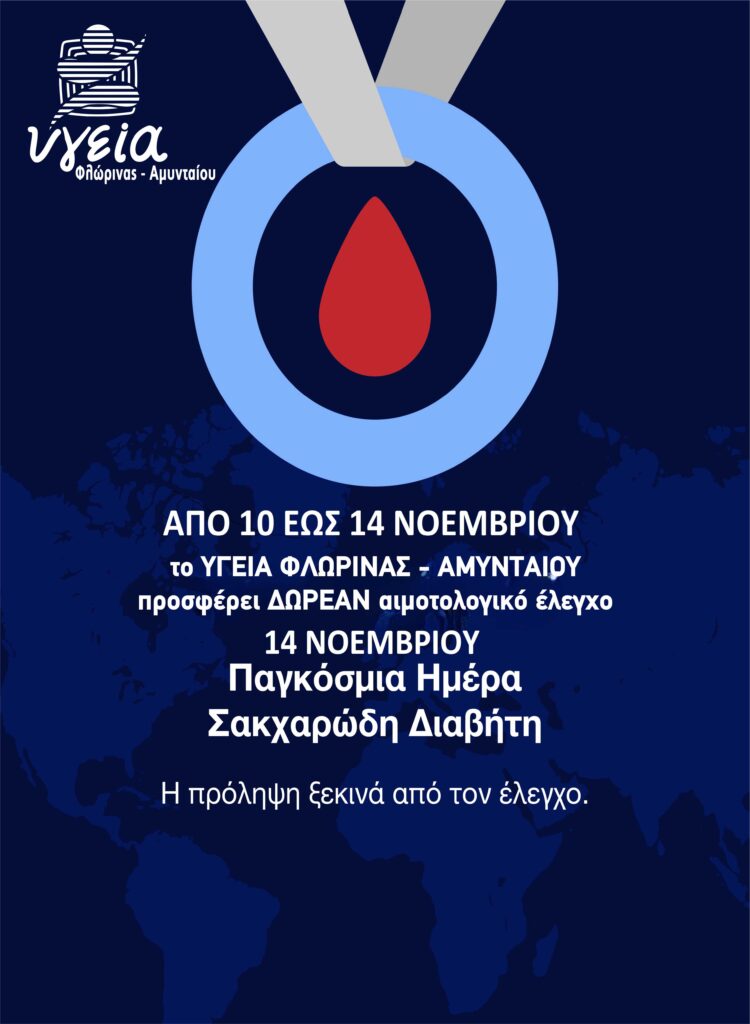 Με αφορμή την Παγκόσμια Ημέρα Διαβήτη14 Νοεμβρίου, το ΥΓΕΙΑ ΦΛΩΡΙΝΑΣ – ΑΜΥΝΤΑΙΟΥ προσφέρει δωρεάν αιματολογικό έλεγχο από 10 έως 14 Νοεμβρίου.